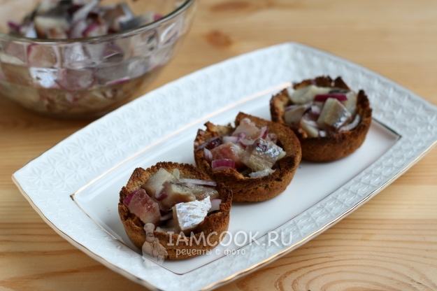 Наполним хлебные заготовки для канапе начинкой из селедки и лука.