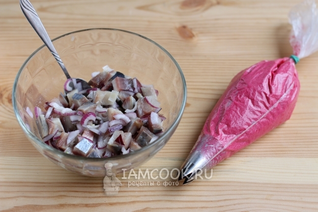 Наполнять эти заготовки будем селедочкой с красным луком, для чего нарежем некрупно красный лук и селедку небольшим кубиком. Готовый свекольный мусс переложим в кондитерский мешок с фигурной насадкой, у меня насадка - открытая звезда.