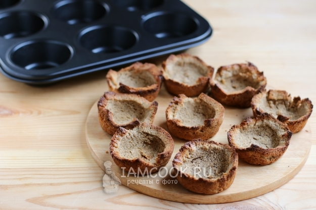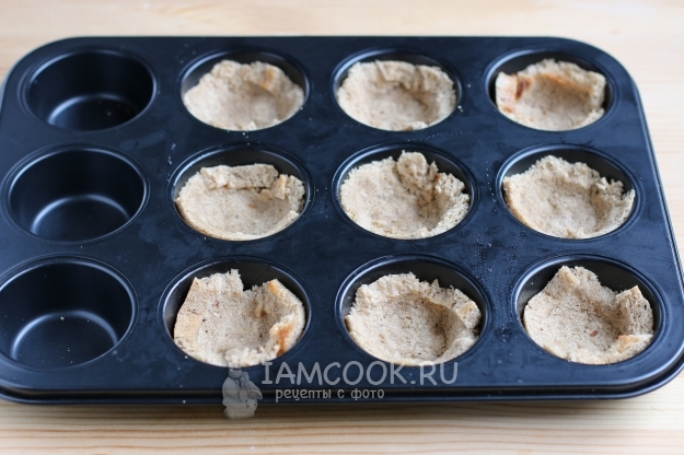 Черный хлеб порежем тонкими кусочками, отрежем корочки и уложим в формочки для кексов, только предварительно смажем формочки растительным маслом. Постараемся каждый кусочек хорошо прижать пальцами к донышку, чтобы они не поднимались. Поставим форму в духовку и подсушим при 160 градусах буквально 5-7 минут.