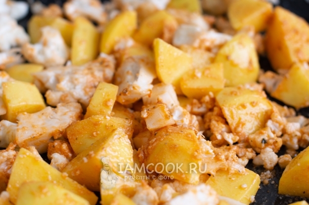 Дальше - капуста. Ее нужно порезать такими же по размеру кусками, как и картошку.