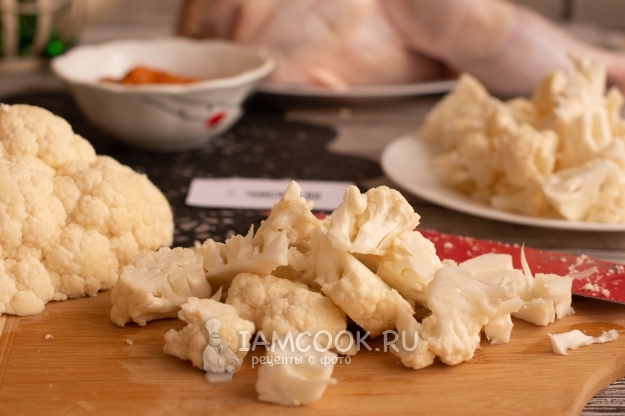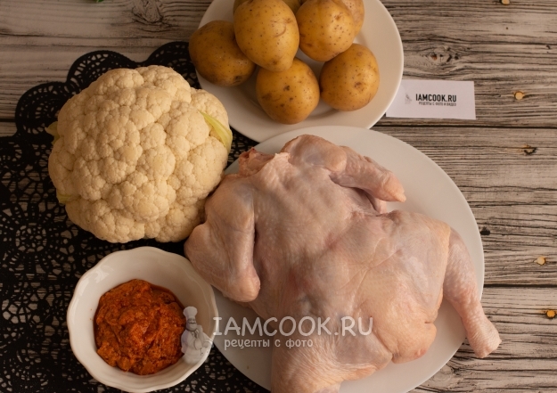 Итак, для начала нужно приготовить все продукты для приготовления курицы с цветной капустой и картошкой в духовке.