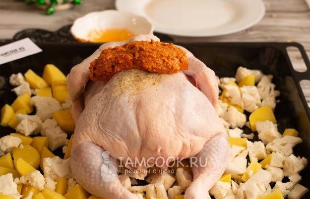 Как следует промазать всю курицу приправами - со всех сторон и внутри.