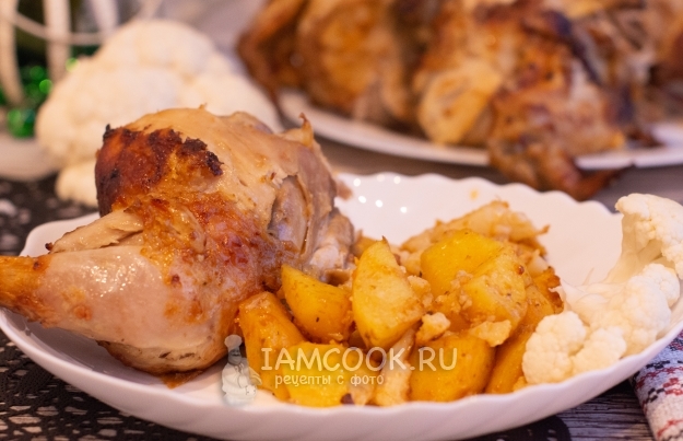 Время приготовления - час. Но это теоретически. Практически же нужно смотреть по ситуации. У меня картофель был готов через 40 минут. А курица - большая. Ей понадобился час с лишним - примерно минут 80-90. Курицу я пару раз перевернула. Еще нюанс - не стоит располагать решетку слишком высоко - курица может подгореть. Ну либо пользуйтесь режимом "конвекция".