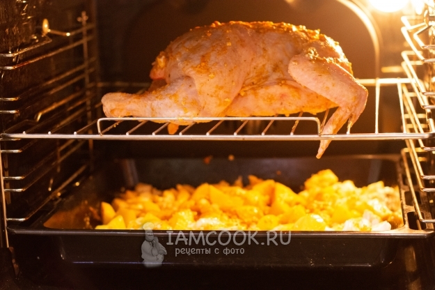 Теперь можно и выпекать. Духовку нужно разогреть до 180 градусов. Противень с курицей нужно поставить вниз духовки. А курицу - в середину, на решетку. Так овощи будут пропитываться куриным соком.