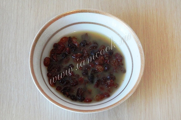 4. Подготавливаем добавку в тесто. Лучше это делать заранее. Изюм промываем, если очень сухой, то предварительно замачиваем в кипятке на 30-40 минут. Ошпариваем кипятком. Заливаем коньяком и соком. Оставляем минут 15.