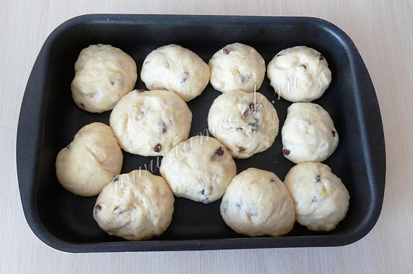 15. Смазываем руки маслом и разделываем тесто на булочки. Выкладываем их на противень на расстоянии 3-5 см друг от друга и оставляем минут на 30. Тесто подойдет еще раз. Смазываем верх булочек растительным маслом и выпекаем в разогретой до 180 градусов духовке минут 15. Булочки должны стать ровного коричневого цвета.