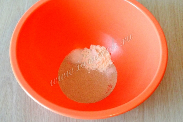 2. Смешиваем дрожжи, 1 ч.л. сахара, 1 ч.л. муки и 1 щепотку соли.