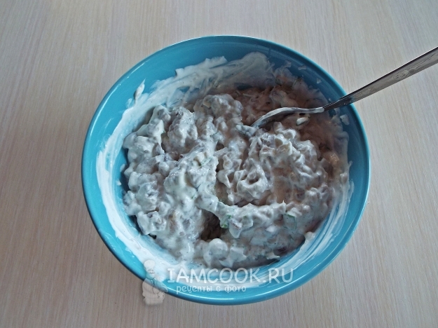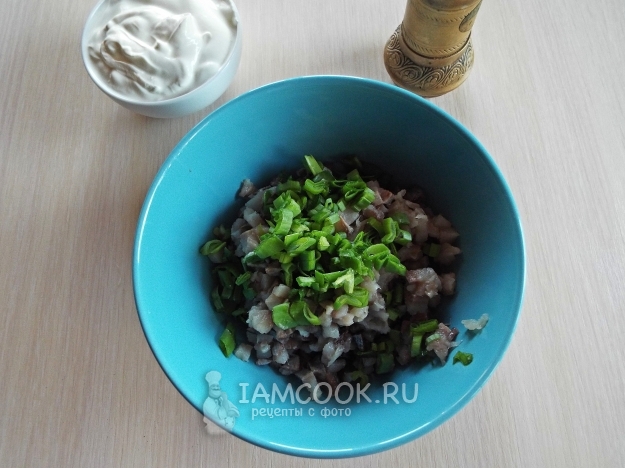 Очень мелко нарезать сельдь и лук.