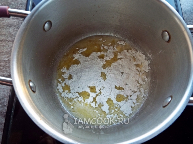 В кастрюльке растопить масло, добавить муку и быстро перемешать, не снимая с огня.