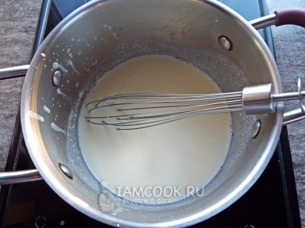 Тонкой струйкой добавить теплое молоко, варить до загустения, помешивая.