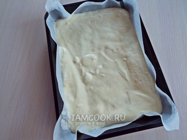 Противень застелить бумагой для выпечки. Выложить тесто.