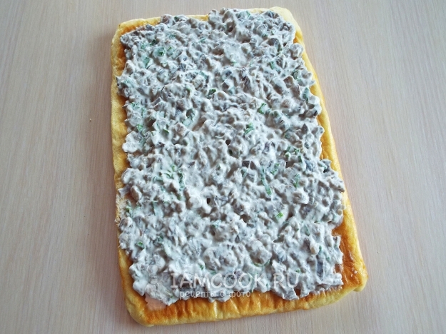 Затем снять бумагу. Выложить начинку и разровнять.