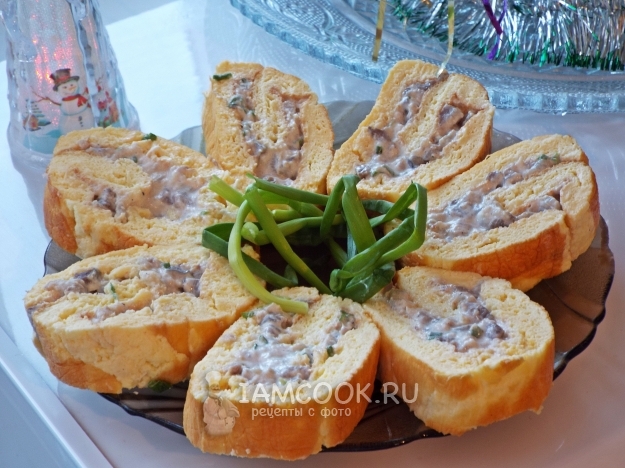 Яичный рулет с сельдью готов. Нарезать и подавать.