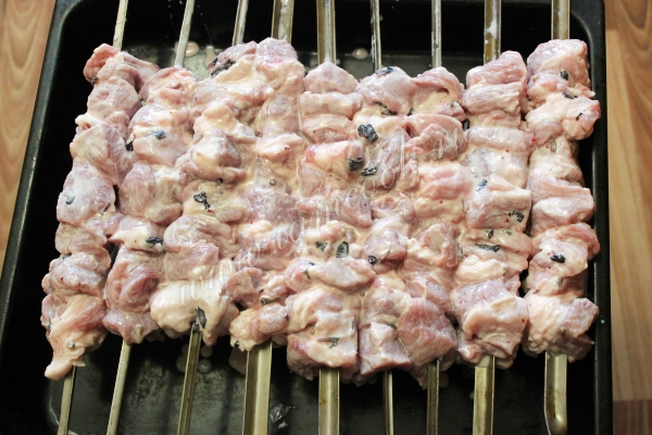 Затем нужно посолить и нанизать куски мяса на шампура.