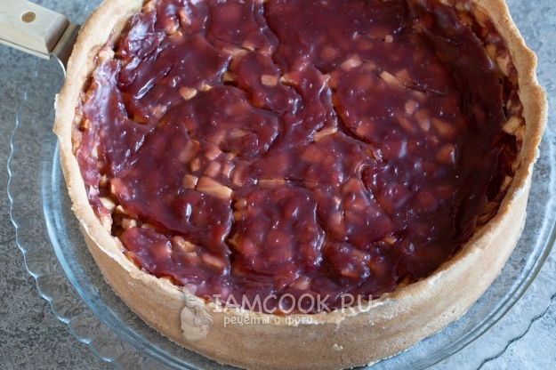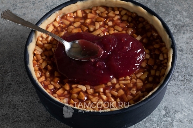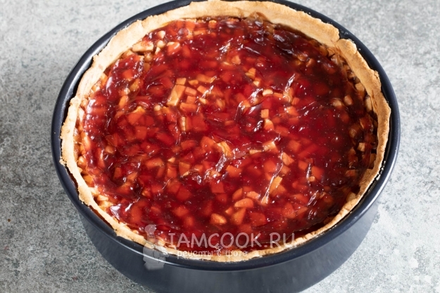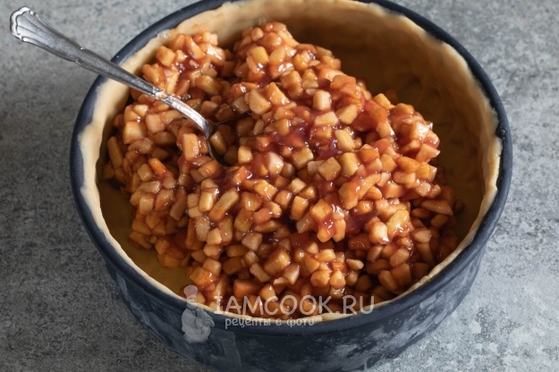 Извлекаем форму с тестом из морозилки, выкладываем в неё яблоки в пунше, разравниваем поверхность, чтобы стала гладкой.