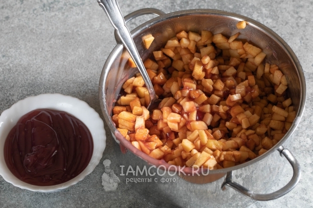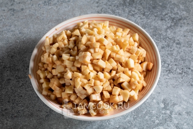 250-300 мл жидкости отливаем в миску, все остальное смешиваем с яблочными кубиками.