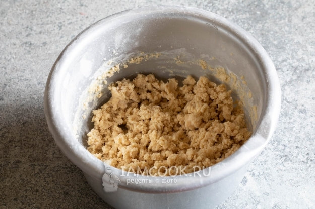 Из муки, сливочного масла, сахара, приправы для пряников и яйца изготавливаем песочное тесто.