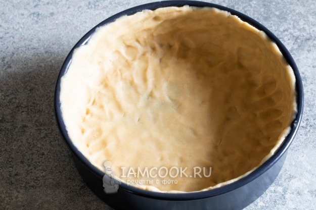 Формируем из теста ком и разминаем его по форме, извлечённой из морозилки. Равномерно распределив тесто по стенкам, опять убираем форму с оболочкой торта в морозилку.