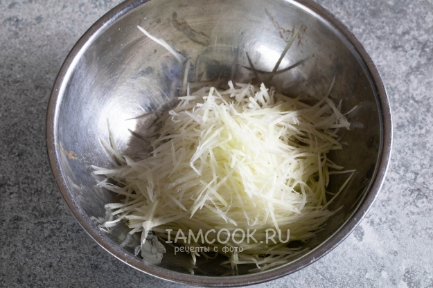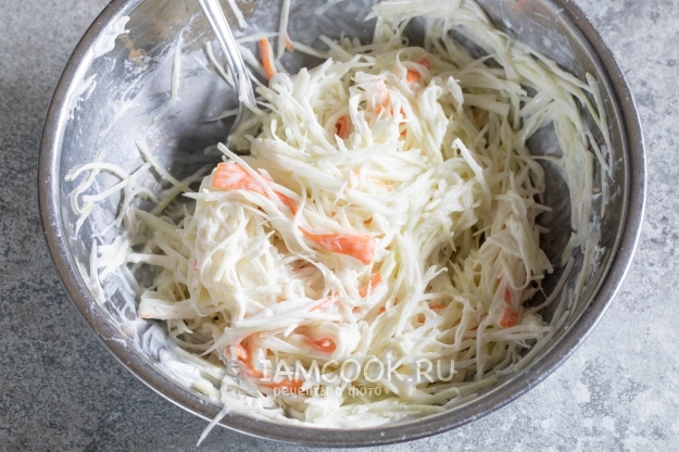 Смешиваем крабовые палочки с тёртой кольраби, сметаной и солью. Хорошо смешиваем!