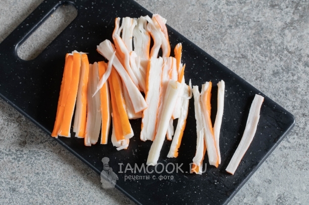 Крабовые палочки режем соломкой вдоль. Если у вас особо длинные крабовые палочки, их сначала режем надвое поперёк, а потом - смотрите предыдущее предложение.