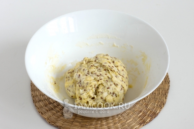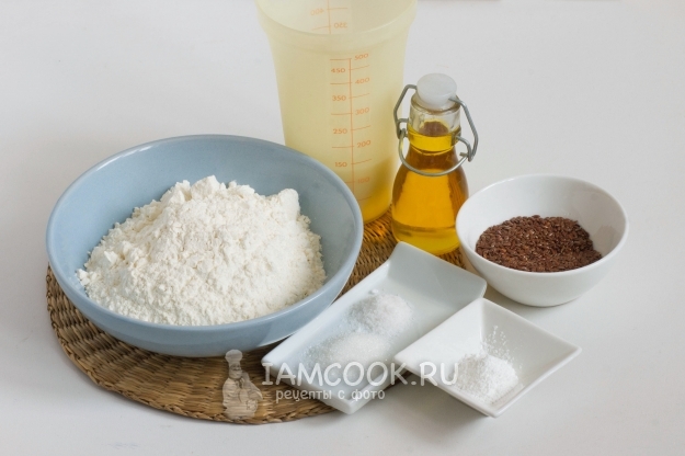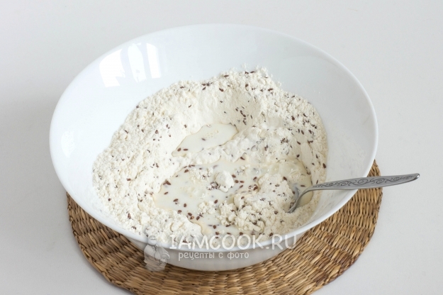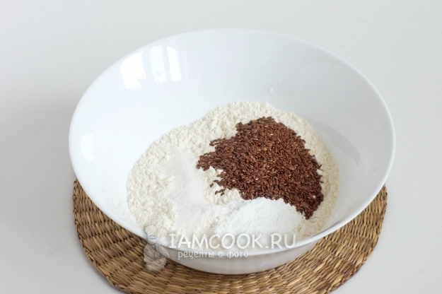 В миске соедините просеянную муку, семена льна, соль (желательно мелкую морскую), разрыхлитель и сахар.