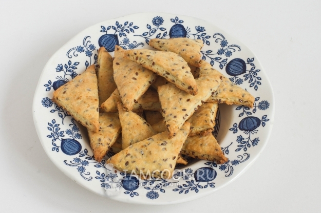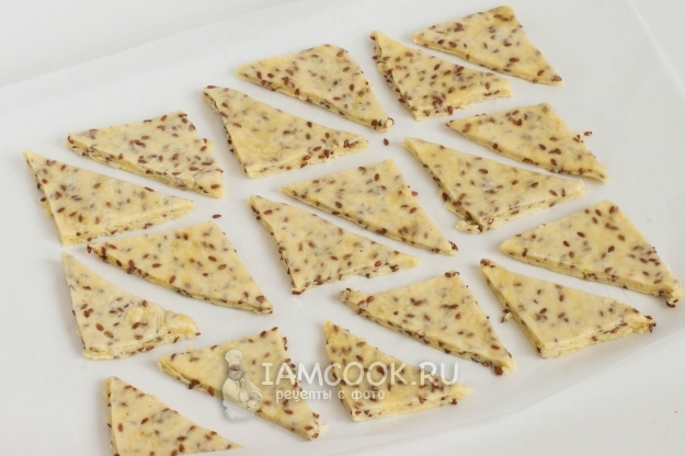 Далее раскатайте тесто на столе, присыпанном мукой, в пласт 2-3 мм толщиной, разрежьте на квадраты, а затем на треугольники (можно нарезать тесто на свое усмотрение). Переложите треугольнички на противень, застеленный пергаментной бумагой, и поставьте в духовку, разогретую до 200 градусов.