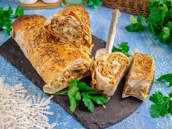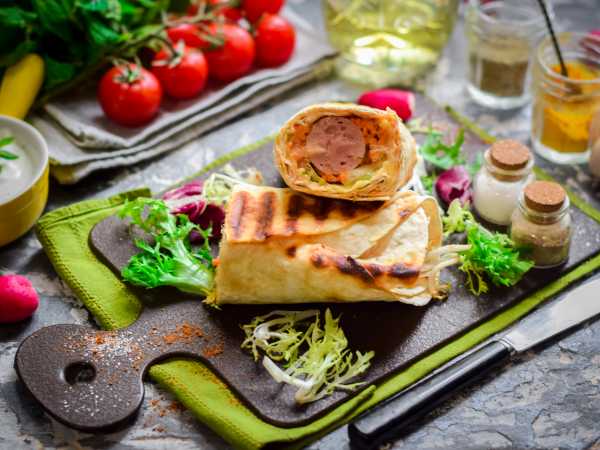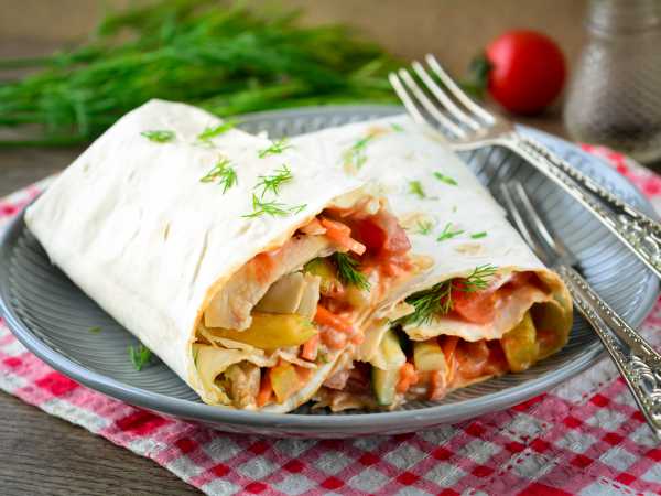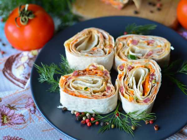 Свернуть лаваш. Рулет из лаваша с шампиньонами и корейской морковью готов.