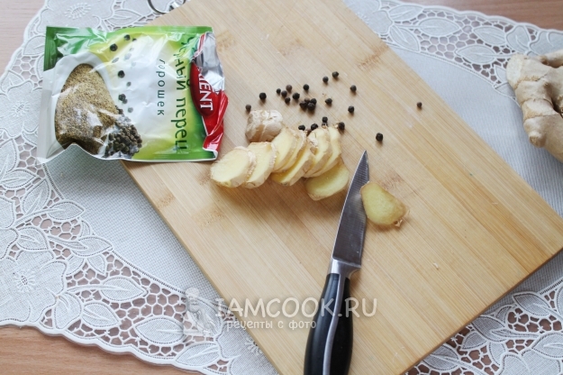 Возьмите 2-3 см корня имбиря и порежьте тонкими пластинками.