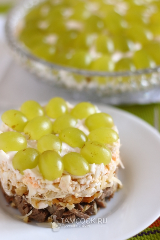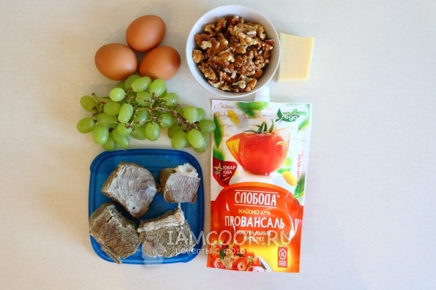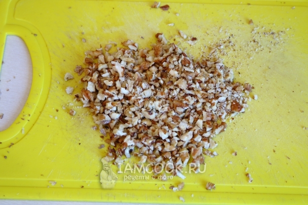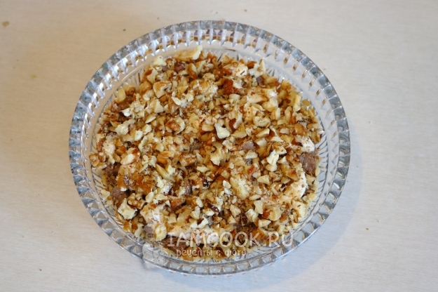 Формируем салат. На дно блюда выкладываем рубленое мясо, сверху покрываем слоем майонеза и присыпаем орехами.