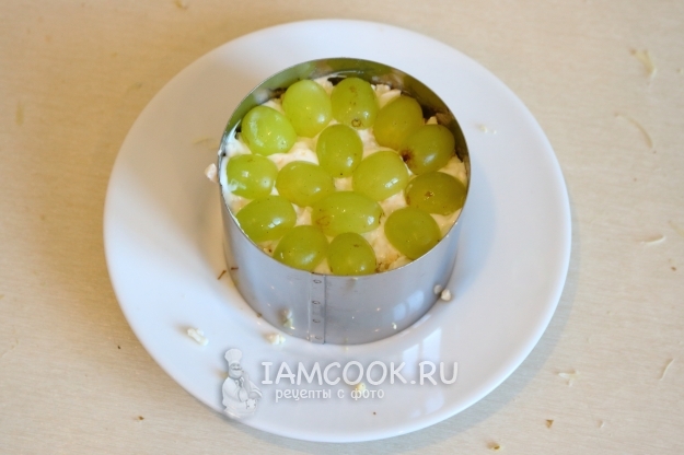 Можно сформовать салат, используя специальную форму с прессом. Готовый салат убираем перед подачей на час-два в холодильник. За это время блюдо охладится и немного пропитается майонезом.