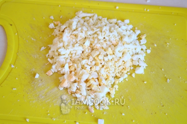 Отваренные яйца остужаем, очищаем от скорлупы и также мелко крошим ножом.
