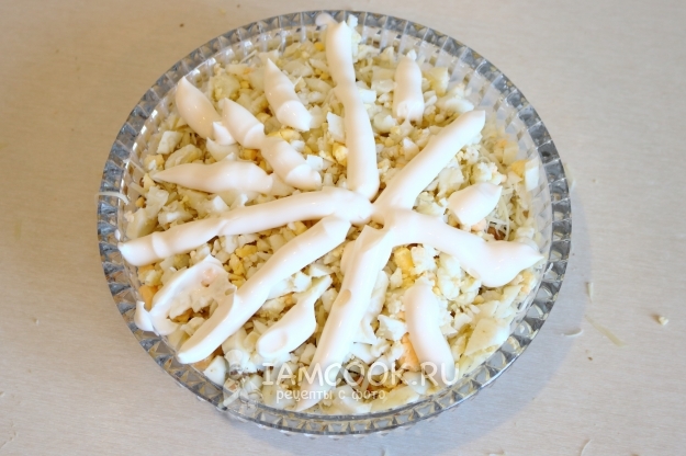 Далее идёт слой сыра, затем - яйца. Майонезом смазываем лишь верхний яичный слой.