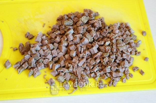 Отваренную и охлажденную говядину при необходимости очищаем от жира и нарезаем мелким кубиком.