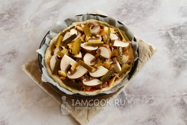 По желанию прибавляем полоски маринованных огурцов и отправляем в разогретую духовку минут на 20-25, выпекаем пиццу с фаршем и шампиньонами при температуре 200-220 градусов.