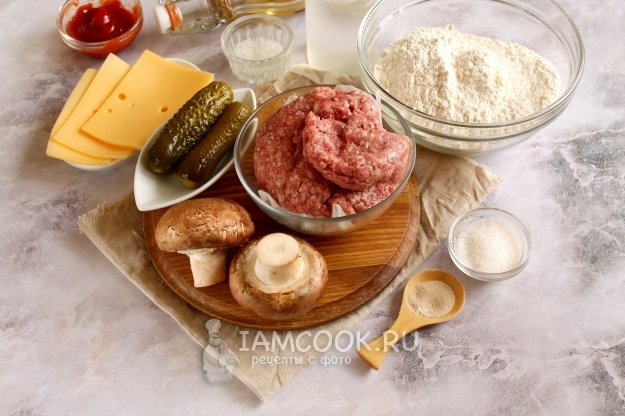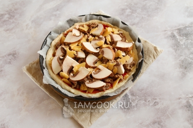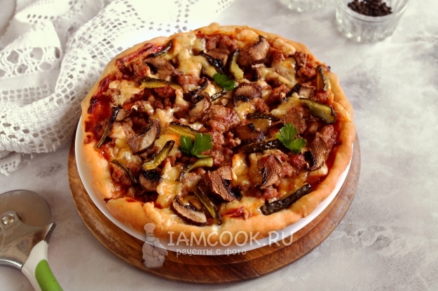 Для приготовления пиццы с фаршем и шампиньонами возьмите продукты по списку.