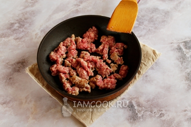 Добавляем мясной фарш. Если нужно, приправьте специями.