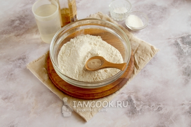 Сперва соединяем сухие ингредиенты: просеянную пшеничную муку, сахарный песок, соль, дрожжевые гранулы. Затем вливаем постное масло и воду (чуть прогретую). Замешиваем мягкое, податливое тесто без комков.