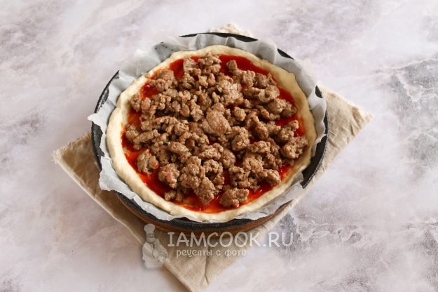 Сытная пицца с мясной начинкой на дрожжевой основе для любителей несладкой выпечки. Тесто замешивают как вручную, так и в комбайне или хлебопечке. Фарш рекомендую выбирать ассорти - например, говядину или птицу со свининой в равных пропорциях — выйдет аппетитно, ароматно и сочно.