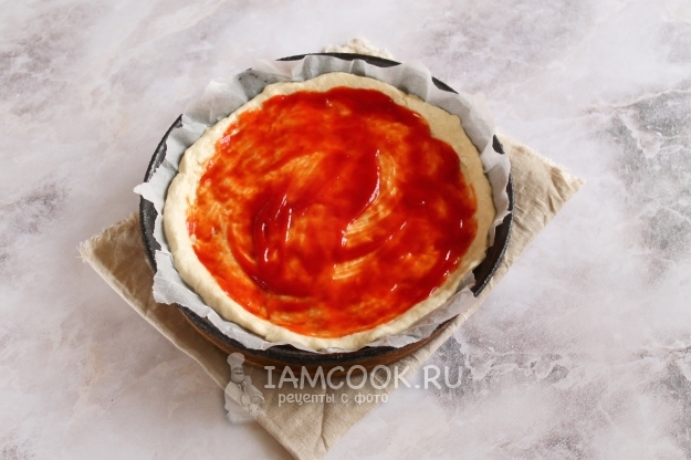 Из дрожжевого теста формируем лепешку. Покрываем кетчупом/соусом (томатным или другим).