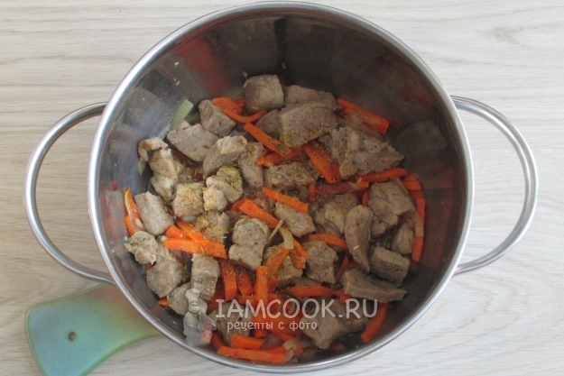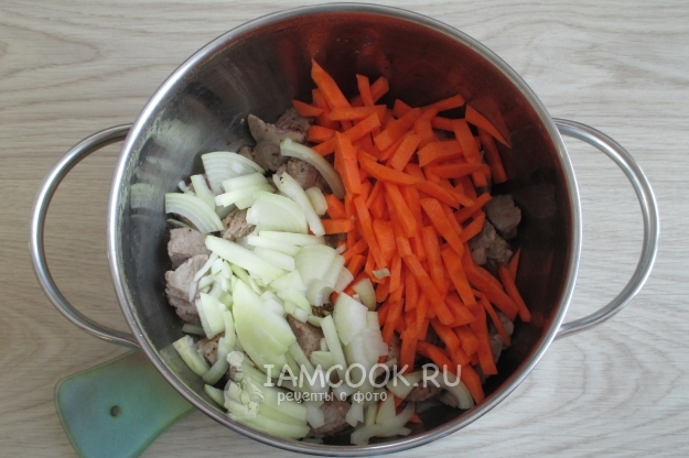 К почти готовой свинине добавьте нашинкованные лук и морковь.