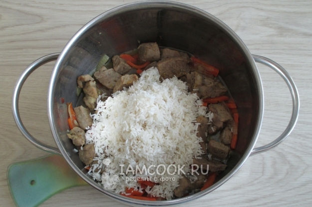 Добавьте рис в кастрюлю к остальным ингредиентам.