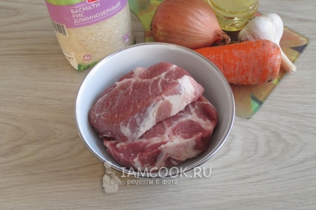 Для приготовления плова со свининой в кастрюле подготовьте ингредиенты по списку к рецепту.