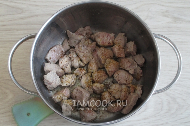 Налейте в кастрюлю столовую ложку растительного масла и уложите кусочки мяса жирными местами на дно.