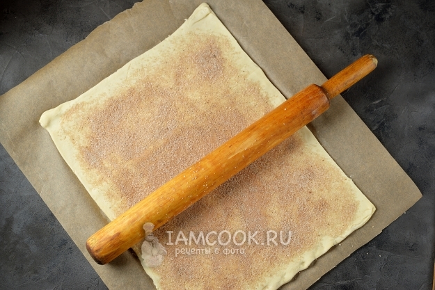 Всю поверхность теста присыпьте сахаром, смешанным с корицей. Очень аккуратно пройдитесь по присыпке скалкой, нужно ее слегка вкатать в тесто.