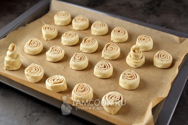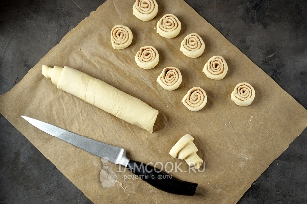 Теперь скрутите тесто рулетом, край смажьте обычной водой. Нарежьте тесто на маленькие рулетики в 1 сантиметр толщиной.