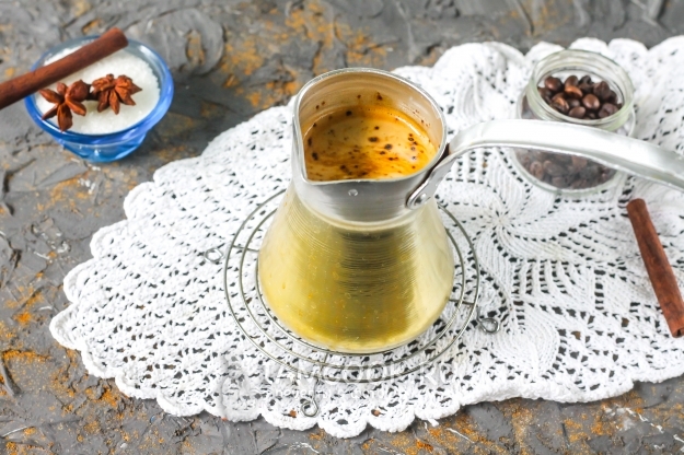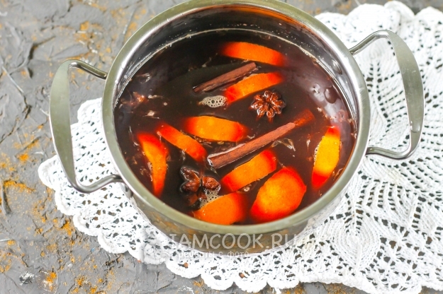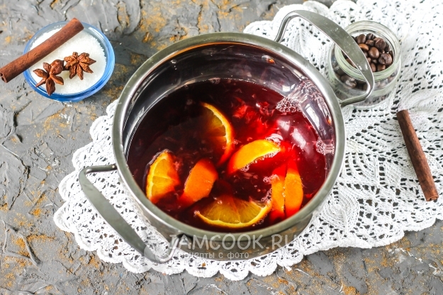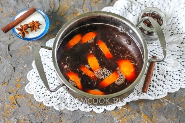 Поместите кастрюлю на плиту, включив минимальный нагрев. Влейте в нее приготовленный кофе и доведите содержимое емкости практически до кипения, но не кипятите. Когда на поверхности глинтвейна появится легкая пенка, выключите нагрев.