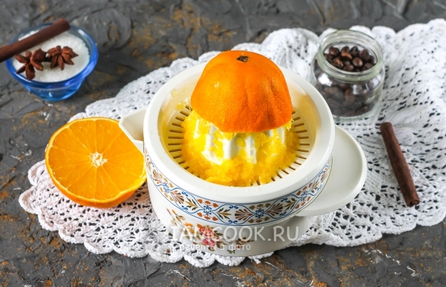 Апельсин обдайте кипятком, разрежьте пополам и из одной половины фрукта выжмите сок.