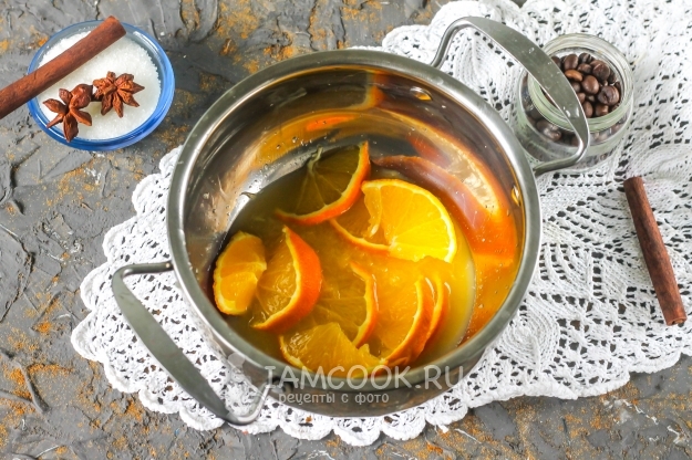 Перелейте его в кастрюлю или ковш, нарежьте ломтиками оставшуюся половинку цитрусового и добавьте нарезку туда же.