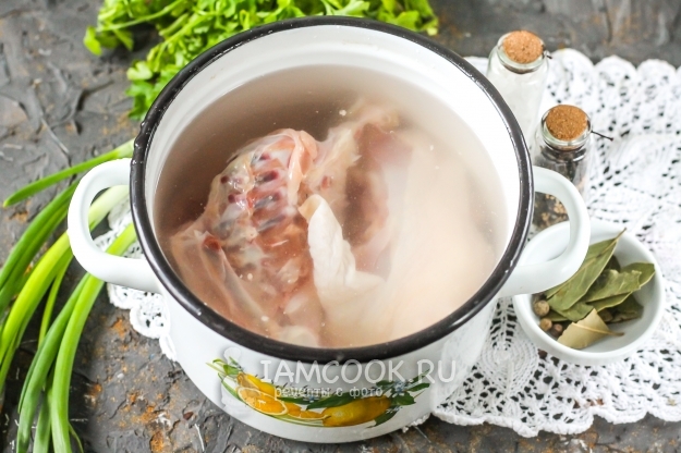 Зальем холодной водой, оставляя сверху небольшое расстояние, чтобы жидкость могла кипеть и не выплескиваться за края емкости. Пряности пока добавлять не будем. Поместим емкость на плиту и доведем ее содержимое до кипения. Сразу же удалим образовавшуюся пену, иначе она в процессе кипения осядет на стенки кастрюли и на дно, делая бульон мутным. Отварим все в течение 30 минут.