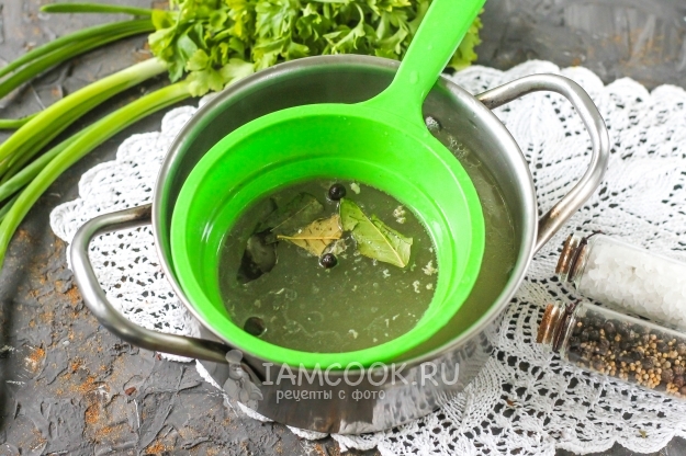 Бульон слегка уварится. Добавим в него лавровые листья, горошины перца, другие пряности по вкусу, кроме свежей зелени и в небольшом объеме, чтобы они не придали бульону зеленоватый оттенок. Отварим до готовности мяса.